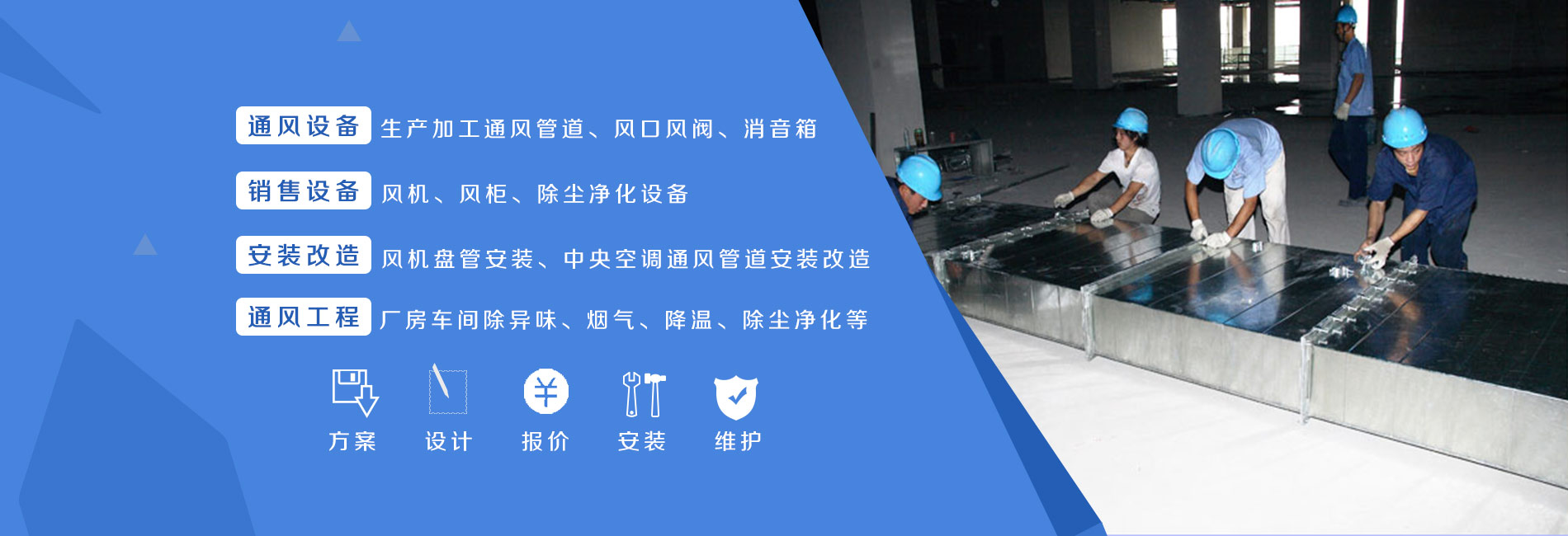主營產品:中央空調安裝,消防通風安裝,排油煙管道安裝,螺旋風管安裝